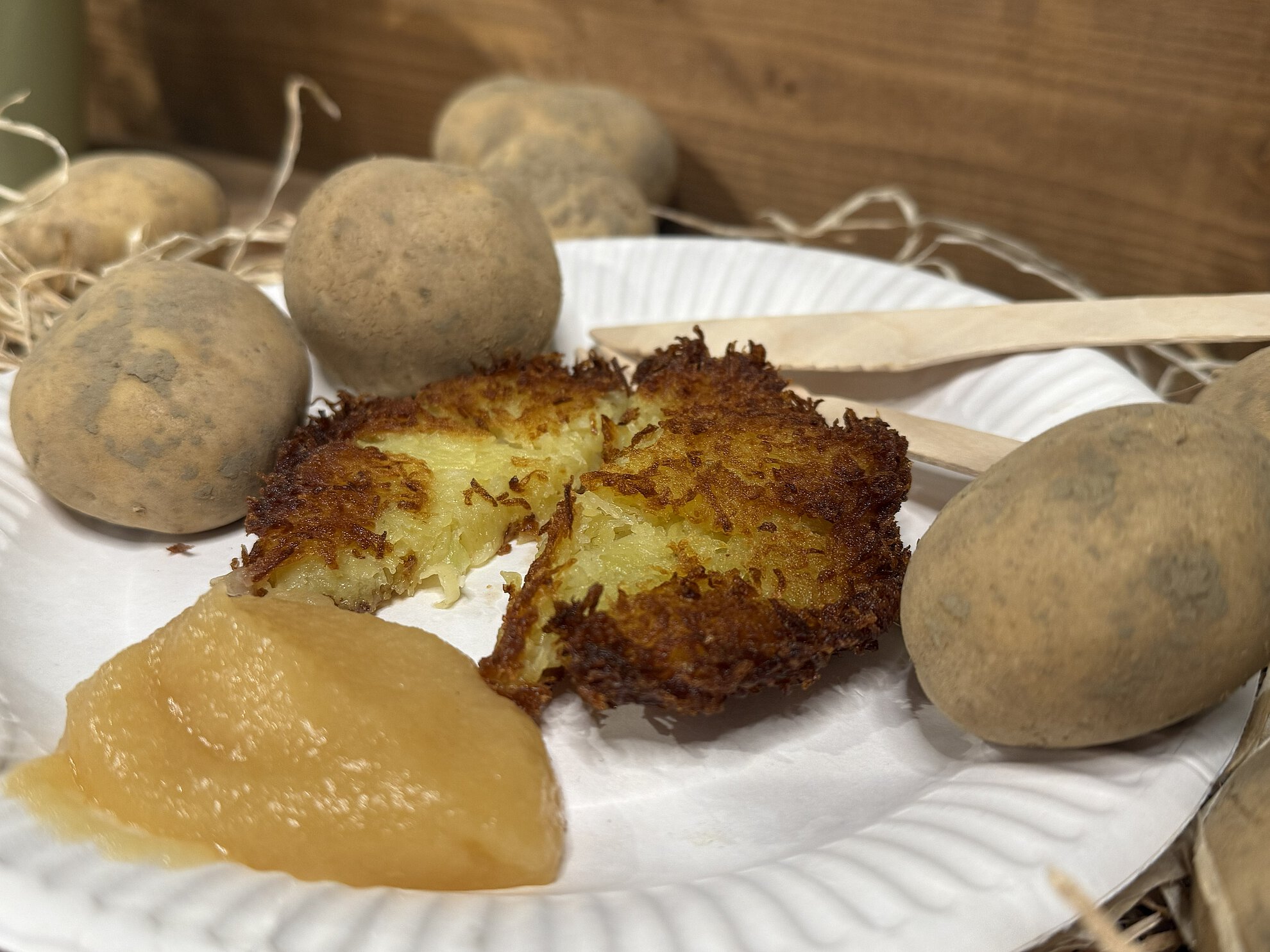 Auf Küchenpapier abtropfen lassen und warm mit Apfelmus servieren.